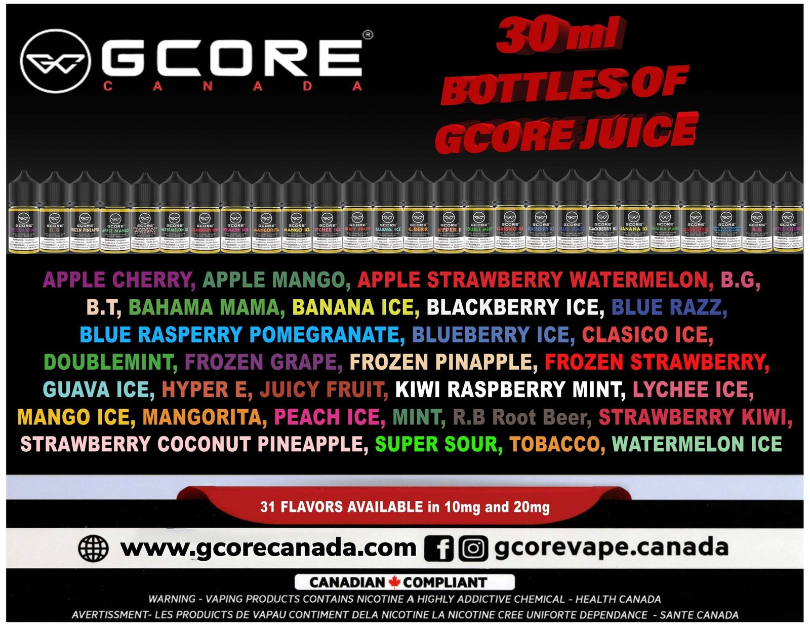 Apple Cherry, Apple Mango, Apple Strawberry watermelon, Bahama-Mama, Banana Ice, BG, Blackberry-ice, Blue-Raspberry-Pomegranate, Blue-razz, Blueberry Ice, BT, Classico-ice, DOUBLE MINT, FROZEN PINEAPPLE, FROZEN STRAWBERRY, Frozen-Grape, Guava-ice, Hyper E, JF, Lychee-ice, Mango-ice, Mangorita, MINT, Peach-Ice, RB, strawberry-coconut-pineapple, Strawberry-kiwi, Super Sour, Tobacco, Watermelon-Ice |
